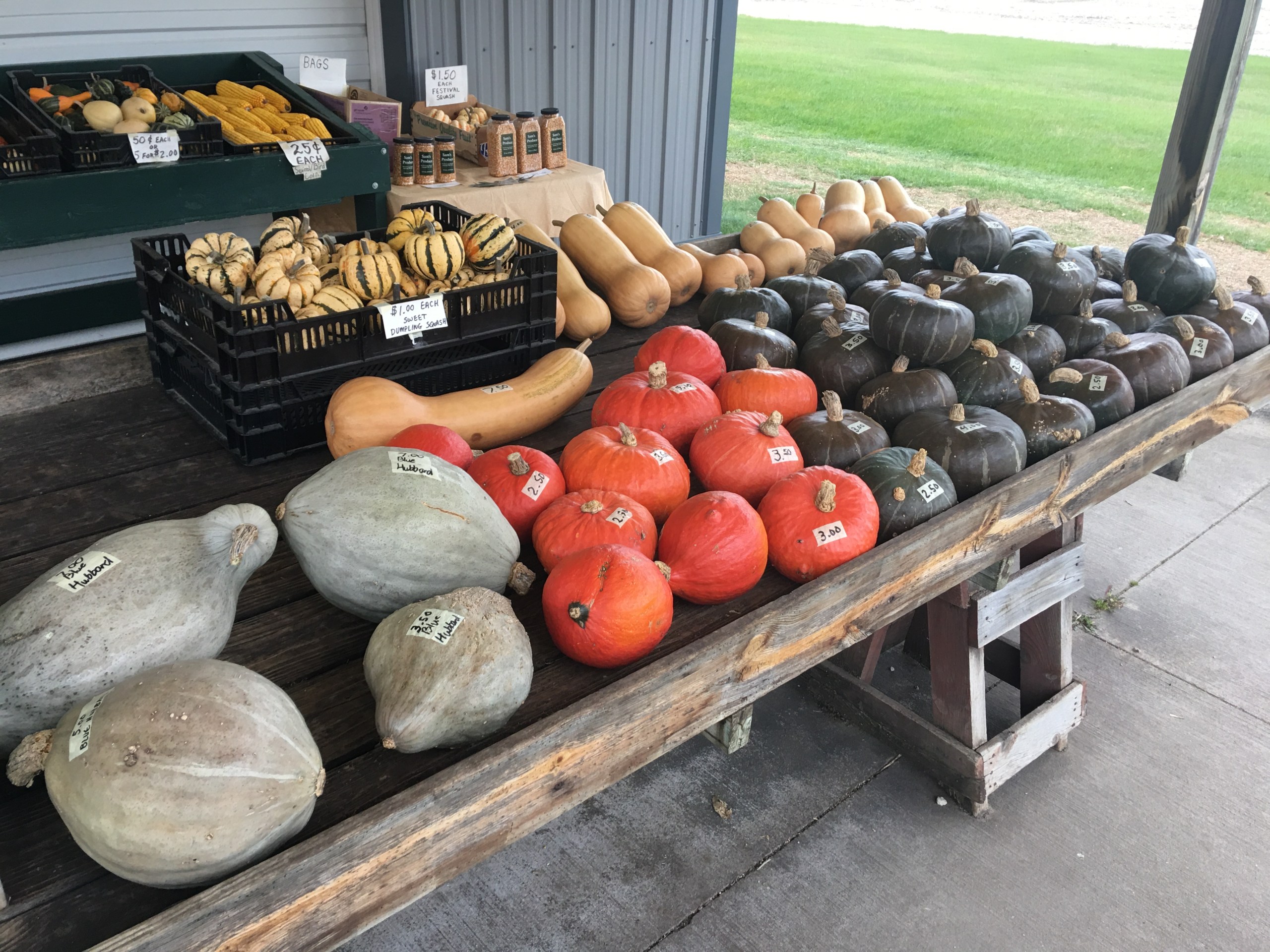 We have many varieties of squash, pie pumpkins, potatoes, gourds, and squirrel corn available.