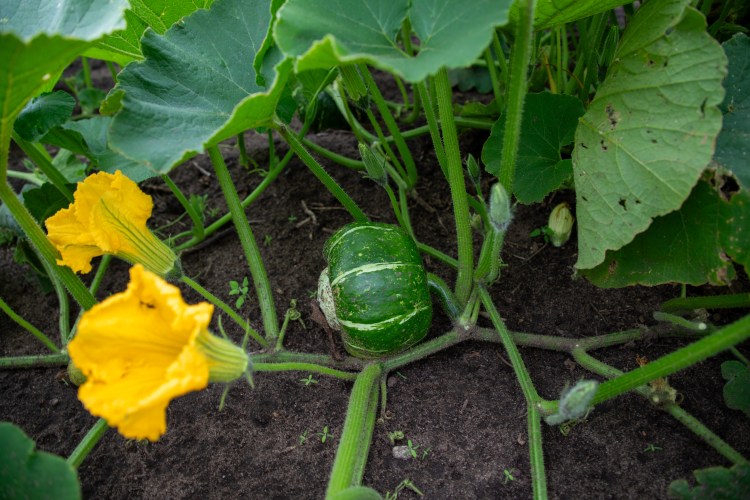The squash is blossoming and we are starting to see small squash on the plants. We typically have most squash varieties available around early to mid September. Photo is of buttercup squash.